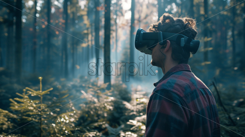 A joyful, interested boy is playing on VR treadmill with helmet, controllers and a backpack. Other people playing nearby, virtual reality Download royalty free stock video footage Royalty Free Stock Video Footage