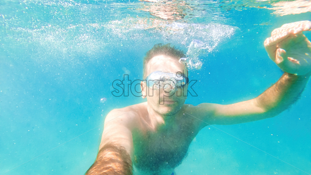 Man in goggles swimming under the blue and transparent water of the Mediterranean sea. Holding the camera