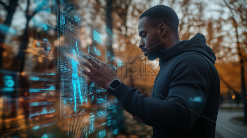 A man using a wearable health device, analyzing his fitness stats displayed