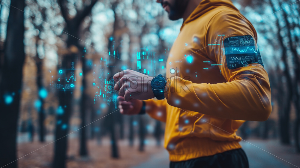 Home » Shop » AI Illustration » A man using a wearable health device, analyzing his fitness stats displayed