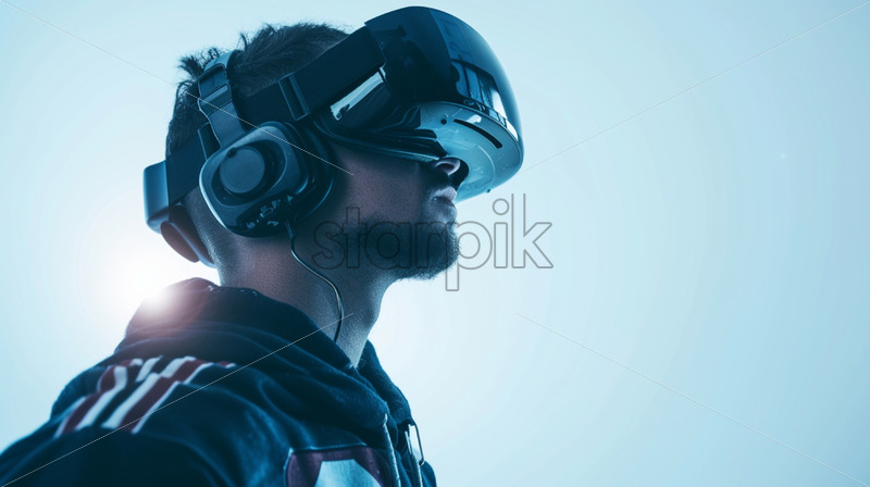 A man watching football game with VR glasses