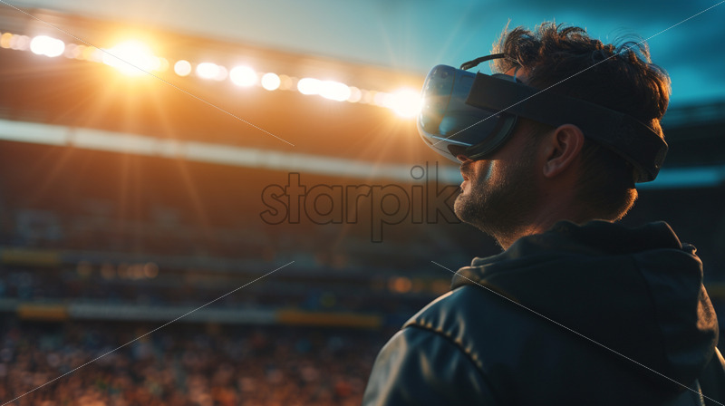 Young girl holding virtual reality helmet while wearing a jacket. Neon red and blue lights on concrete background. Place for text Royalty Free Stock photo