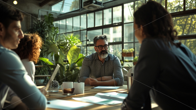 Caucasian mature man and woman at meeting table discussing a business plan with laptop computer in office. Workers on background Royalty Free Stock photo