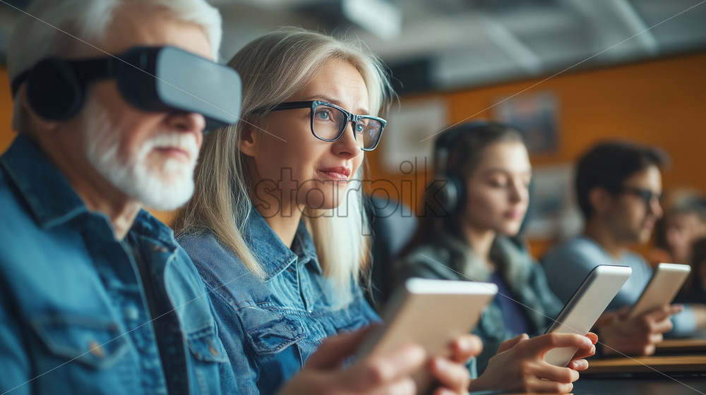 A cute girl having a virtual meeting with their colleagues in Vr glasses