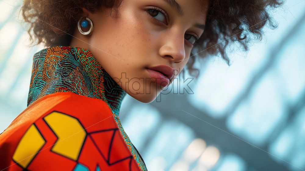 a model wearing clothing inspired by quantum circuits and geometric patterns