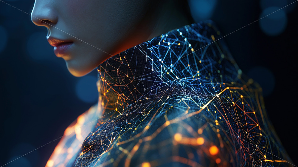 a model wearing clothing inspired by quantum circuits and geometric patterns