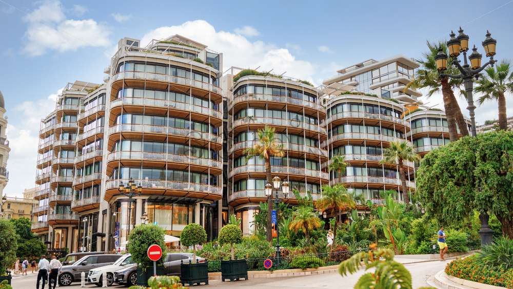 MONACO – SEPTEMBER 6, 2021: A modern building, a lotof greenery in front of it, people, cars
