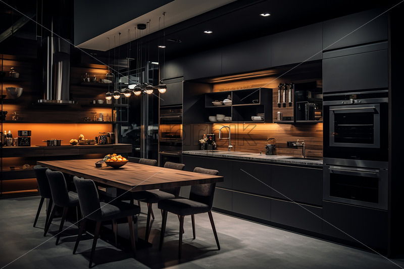 Modern house architecture in the city with clear glass wall in front of the dining table and kitchen with cinematic ambience and veranda overlooking in the city