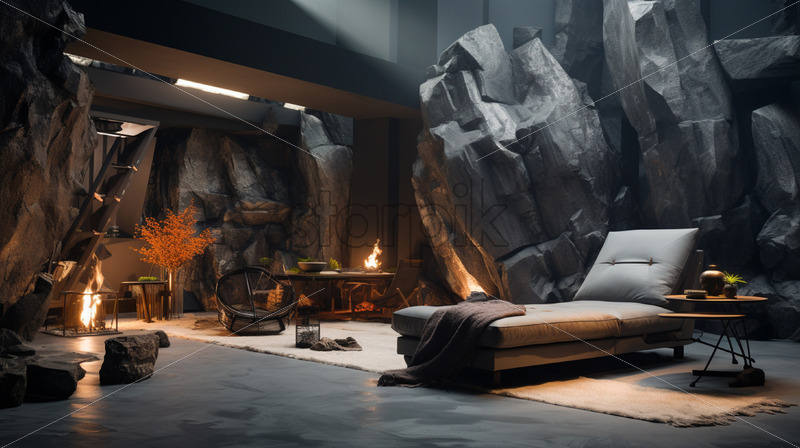 Modern house architecture in the city with clear glass wall in the lounge and second floor with wooden stair and a bright ambience on cozy couch with indoor plants