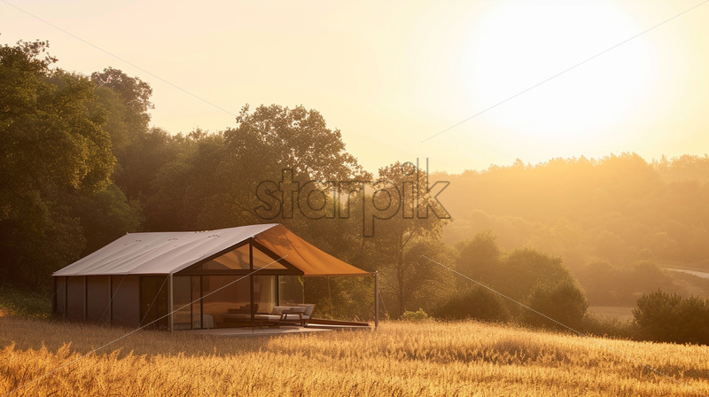 Transparent bubble tent at glamping, Lush forest around and interior. Woman in bathrobe reading a book, view from inside
