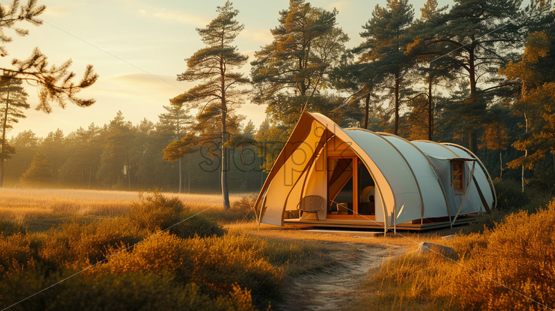 Transparent bubble tent at glamping, Lush forest around and interior. Woman lying on the bed and looking outside, drone view
