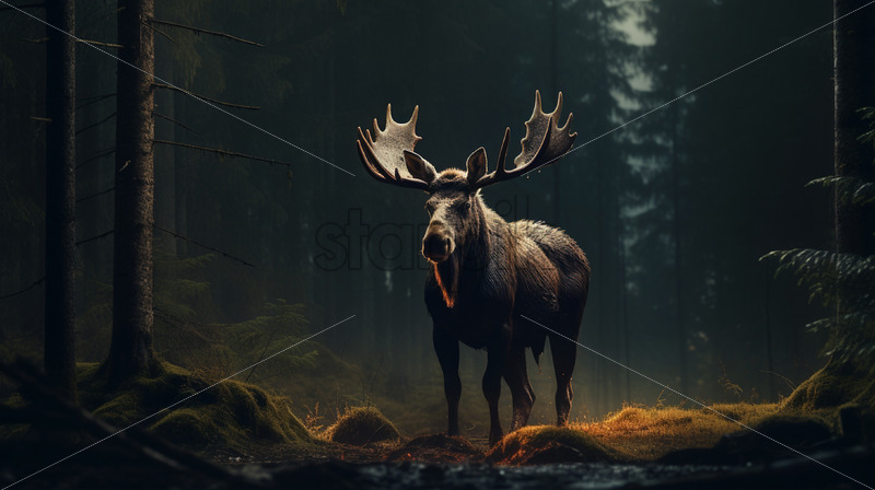 Deer on a lawn in the Carpathians, forest around it, Romania