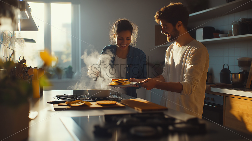 A loving family in a warm kitchen joyfully bakes homemade cookies together, faces beaming with laughter and anticipation.