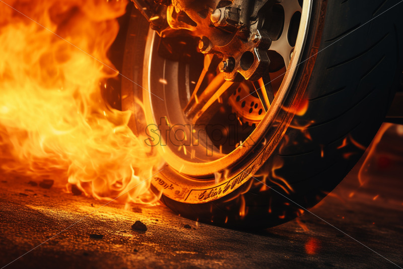 A motorcycle wheel on fire