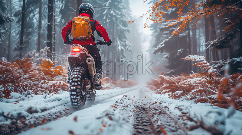 Home » Shop » Uncategorised » A motorcyclist sportsman through the forest in winter