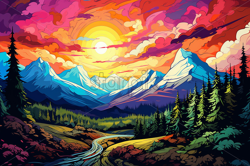 A road in Switzerland at sunset blue hour. Mountains covered in snow on background.