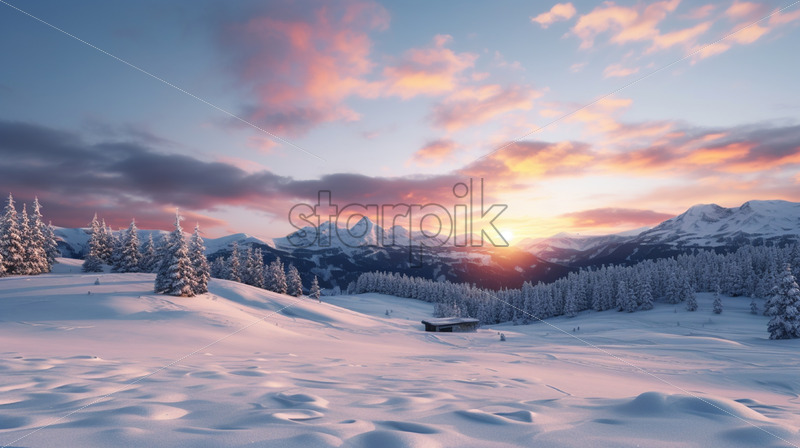 Landscape of a snowy terrain and trees covered in snow on the top of the mountain. Sun shining in the background