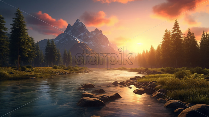 A mountain landscape with a river, mountains and forests at sunset