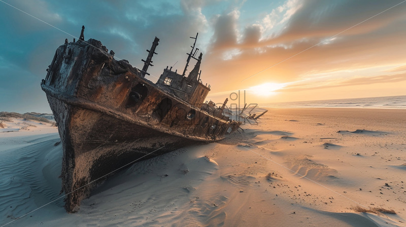 A mysterious shipwreck partially buried in the sand, telling tales of the past