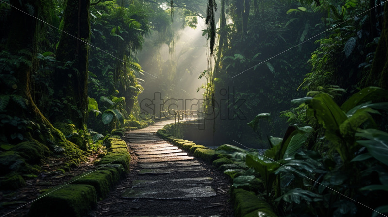 Home » Shop » Uncategorised » A narrow, winding path through the jungle, shrouded in mist, with the promise of undiscovered wonders ahead