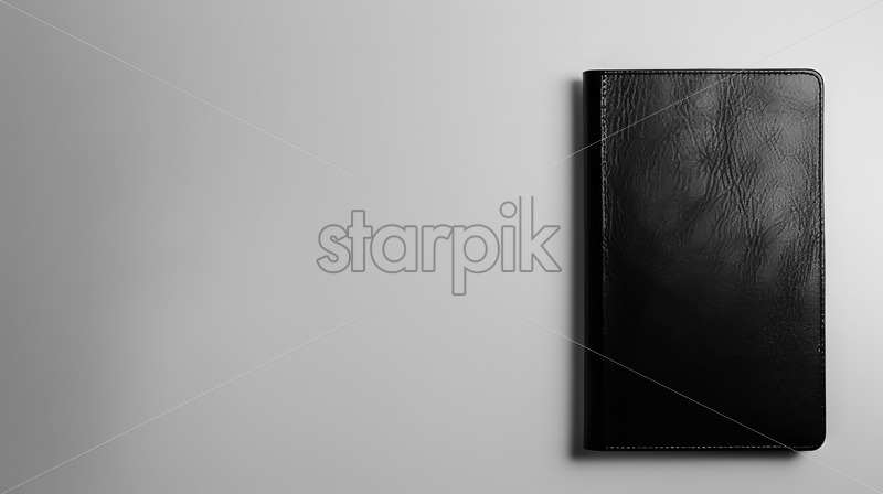 A notebook with a black cover on a white background