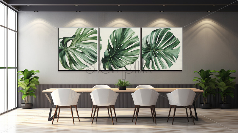 A painting of tropical leaves on a gray wall