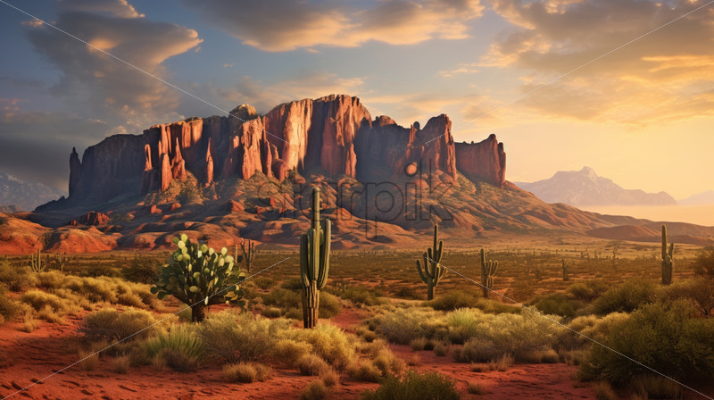 Home » Shop » Uncategorised » A panoramic shot of the Superstition Mountains bathed in the warm glow of sunrise