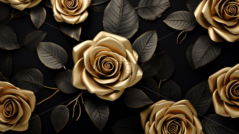 A pattern of golden roses on a black background