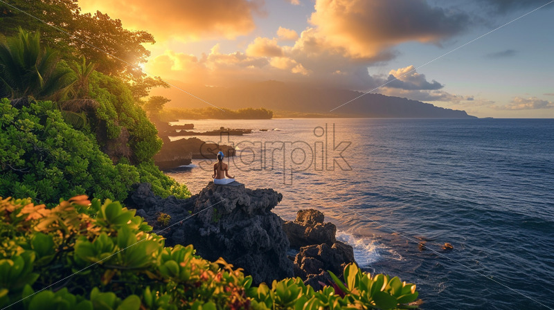 A peaceful yoga retreat overlooking the serene ocean expanse