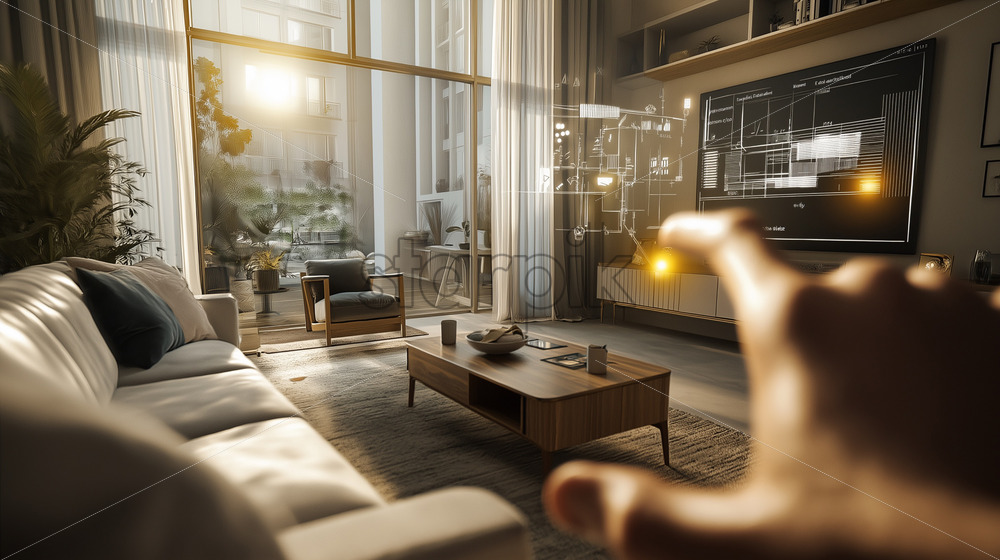 Home » Shop » AI Illustration » a person living room using mixed-reality spatial computing to control their home: resizing holographic furniture, adjusting lighting with gestures