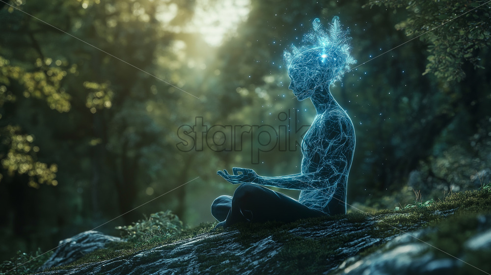 a person meditating with neural enhancement tech glowing around their head AI assistant