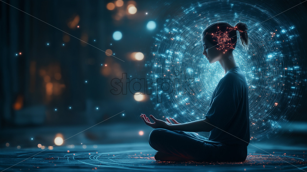 a person meditating with neural enhancement tech glowing around their head AI assistant