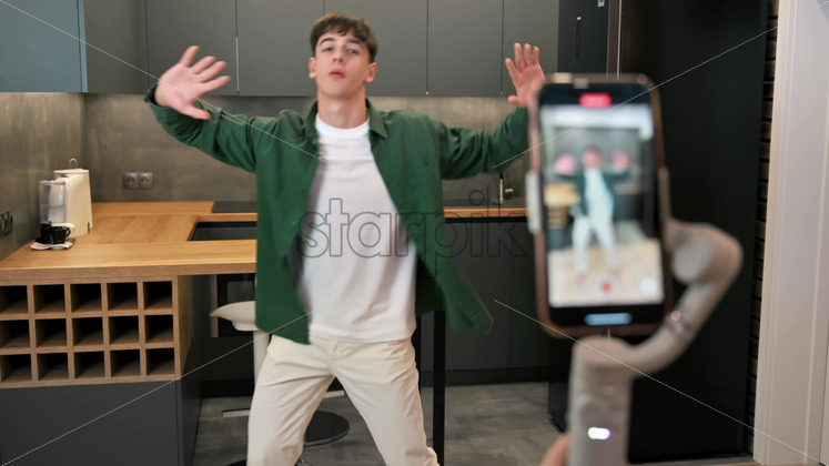 A person recording a young dancing man blogger influencer on smartphone on a stabiliser in a studio Royalty Free Stock Video Footage