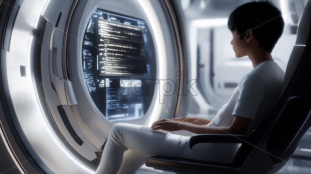 holographic user interface being manipulated by a person in augmented reality glasses in front of a quantum computer