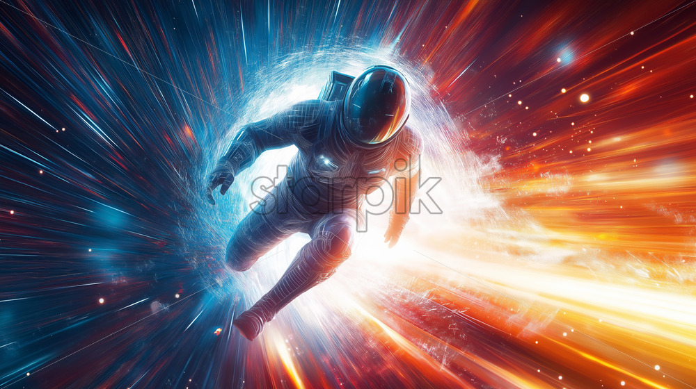 A person wearing a quantum suit, racing through a glowing tunnel of light