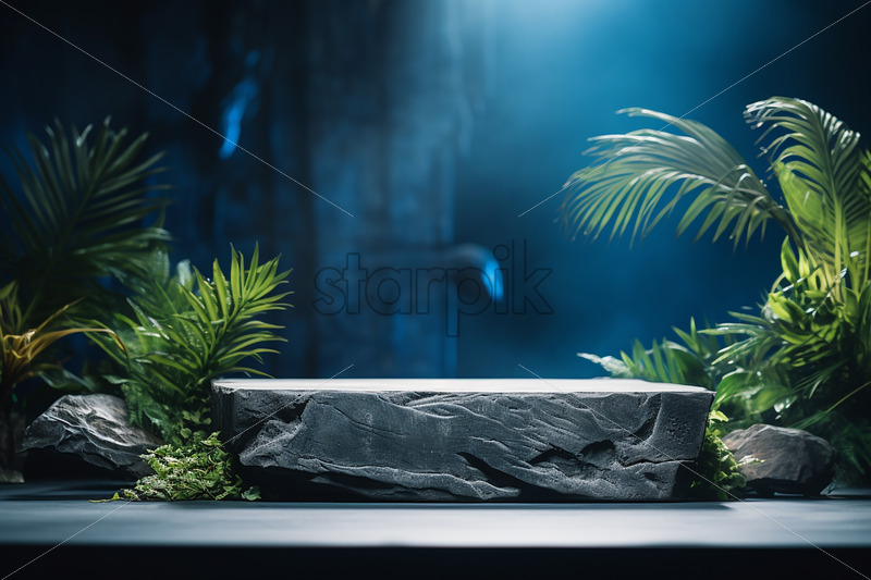 A piece of stone in the form of a podium in a studio, lots of greenery