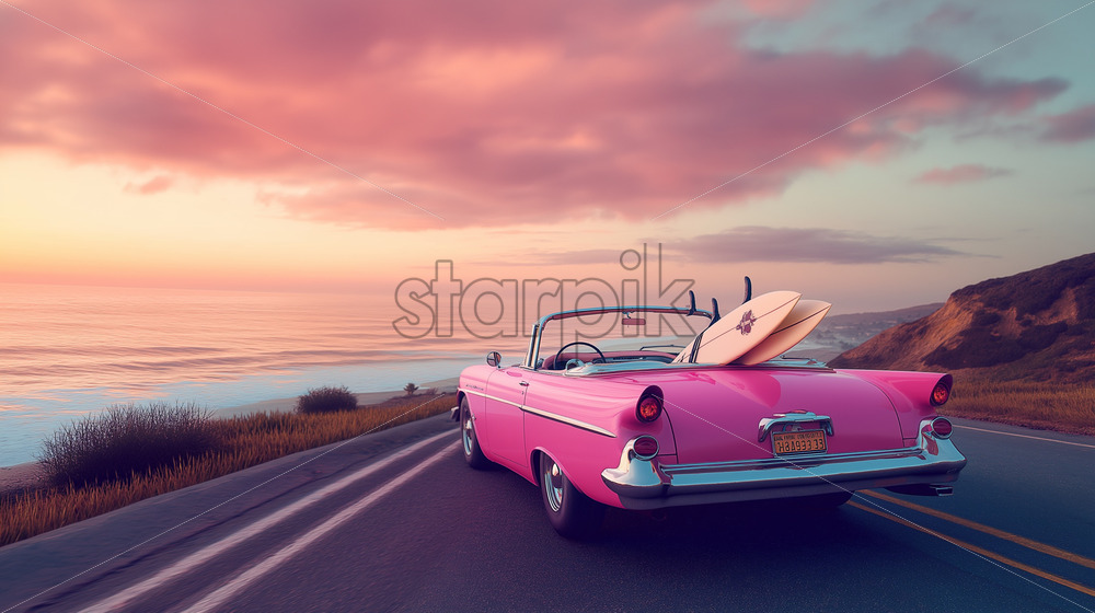 a pink car on the road voyage vintage card