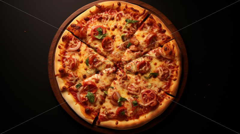 A pizza on a black background, top view