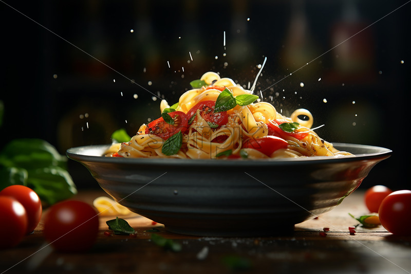 A plate of pasta with tomato and basil