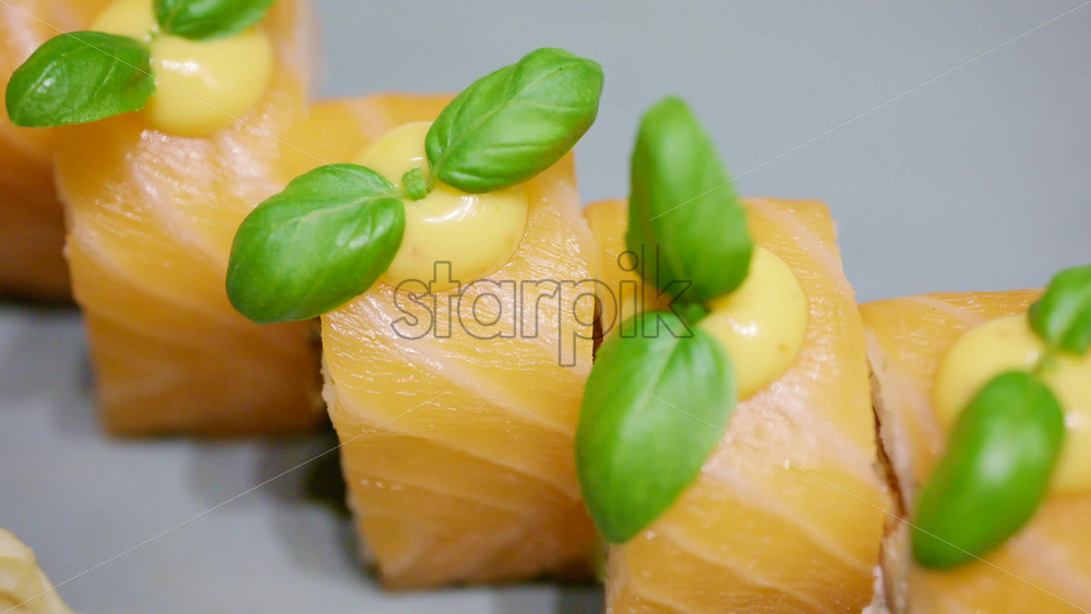 Close up of a beautifully plated fish fillet with sauce, lemon slice, and herbs Royalty Free Stock Video Footage