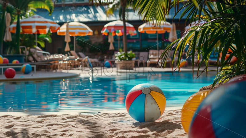 A pool party at a beach resort with a sandy area, beach balls, and beach-themed decor