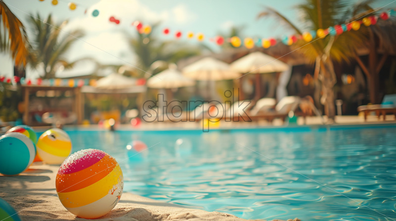 A pool party at a beach resort with a sandy area, beach balls, and beach-themed decor
