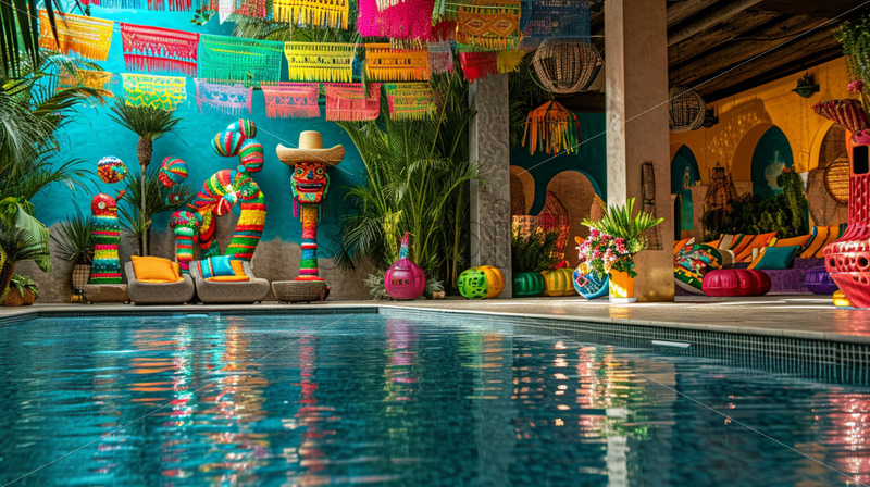 A poolside fiesta with a Mexican theme, featuring piñatas, sombreros, and a salsa dance floor