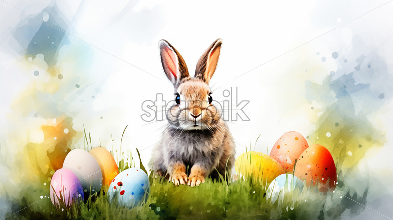 A rabbit with eggs painted on the grass in watercolor clipart style