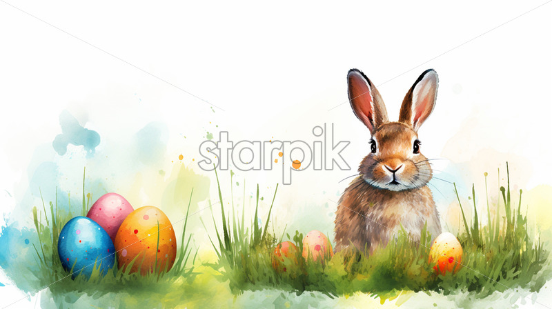 A rabbit with eggs painted on the grass in watercolor clipart style