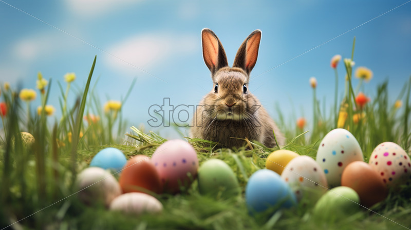 Home » Shop » Uncategorised » A rabbit with painted eggs on the grass