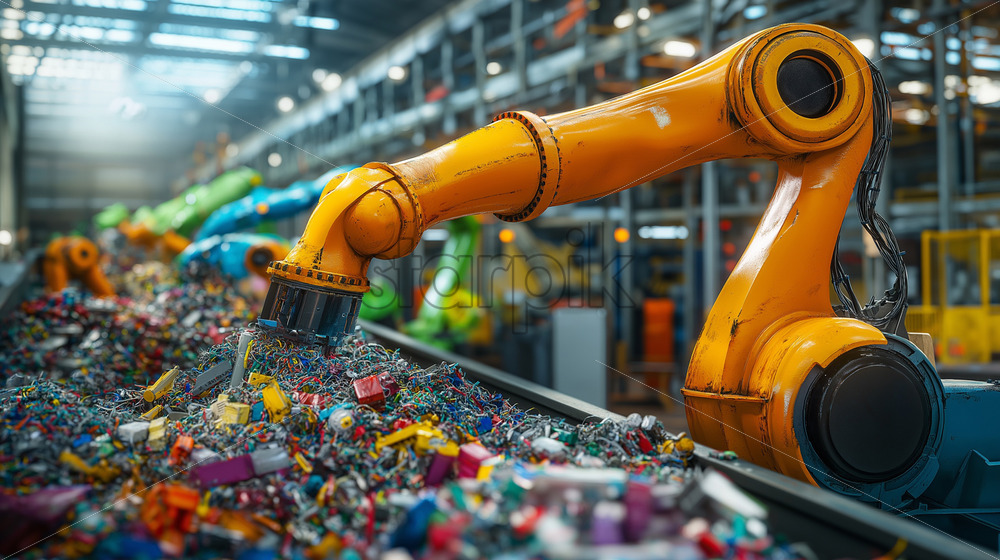 Home » Shop » AI Illustration » A recycling facility where colorful robotic arms sort materials