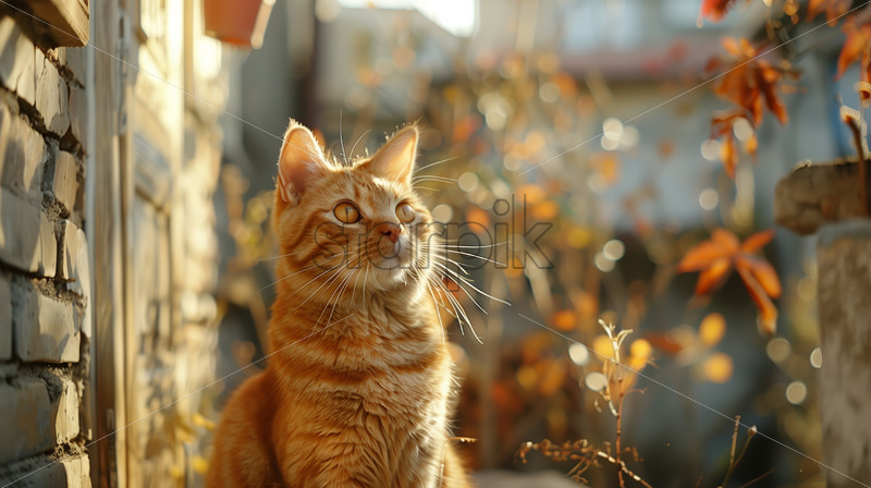 Video – Cat with vivid yellow eyes stands alert against a brick wall, tail raised