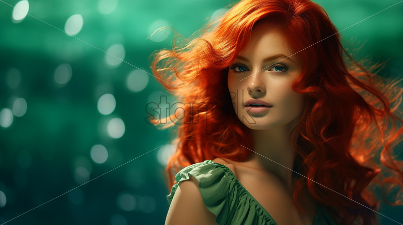 A red-haired woman dressed in green on a green background, in the style of the 70s