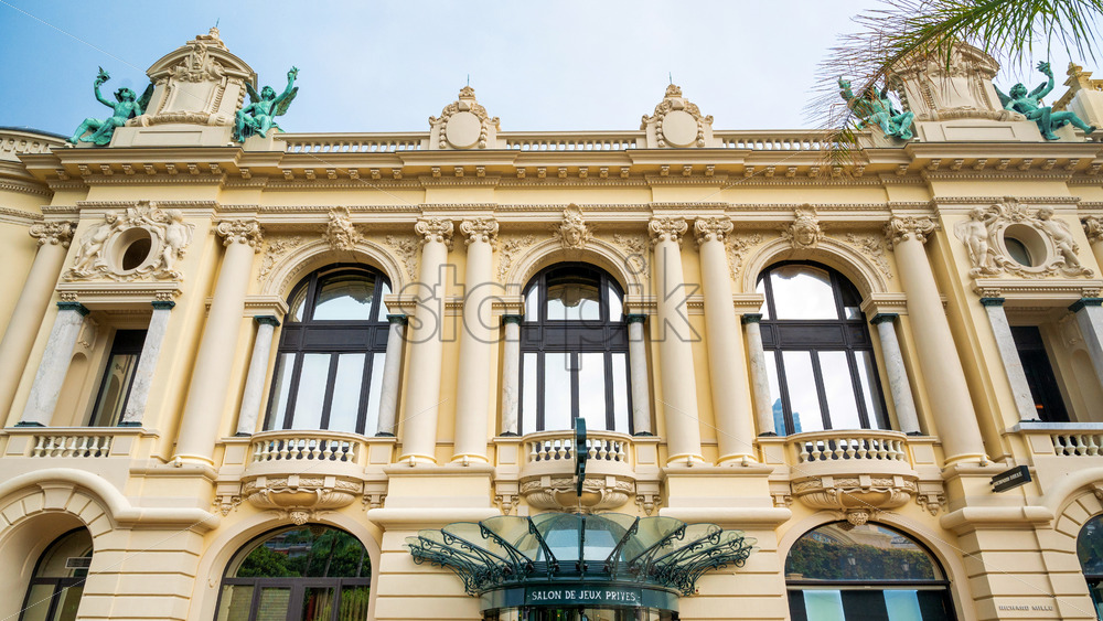MONACO, FRANCE – JUNE 28, 2017: View from bottom to Monte-Carlo Casino facade with classic ornaments. Bright blue sky with clouds on background.